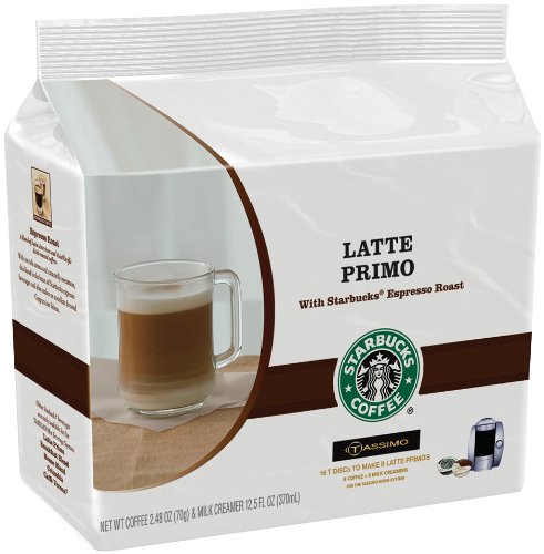 Starbucks Latte Primo, T-Discs for Tassimo Coffeemakers comes with 16 count packs. With its rich aroma and caramelly sweetness, this blend is the heart of Starbucks espresso beverages and also makes an excellent brewed Latte Primo. Starbucks coffee T DISCs were developed with the correct proportion of coffee to water an essential part of the Starbucks brewing philosophy. That's how we ensure only the fullest flavors will be extracted to yield the richest, most aromatic cup of coffee possible.